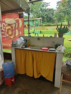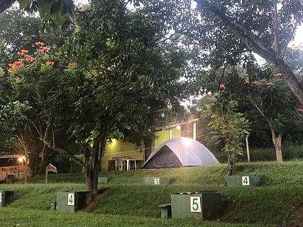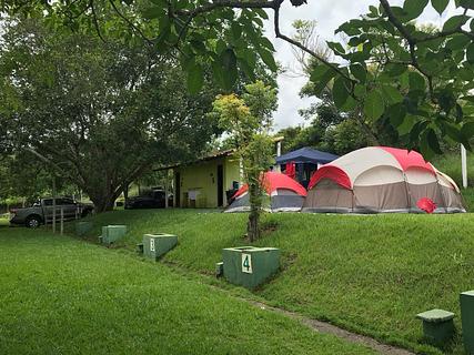 The camping is next to the water park (take the road left of the entrance), there is plenty of spaces for tents but no shade and no cover for rain. Because when we arrived it was raining a lot and the campsite was empty the owner let us pitch our tent in the kitchen area. The bathrooms were clean and the owner is very nice and helpful, she let us use the dryer and offered us coffee and a small breakfast in the morning! There's also the option to sleep in a trailer We paid 40 reais pp
