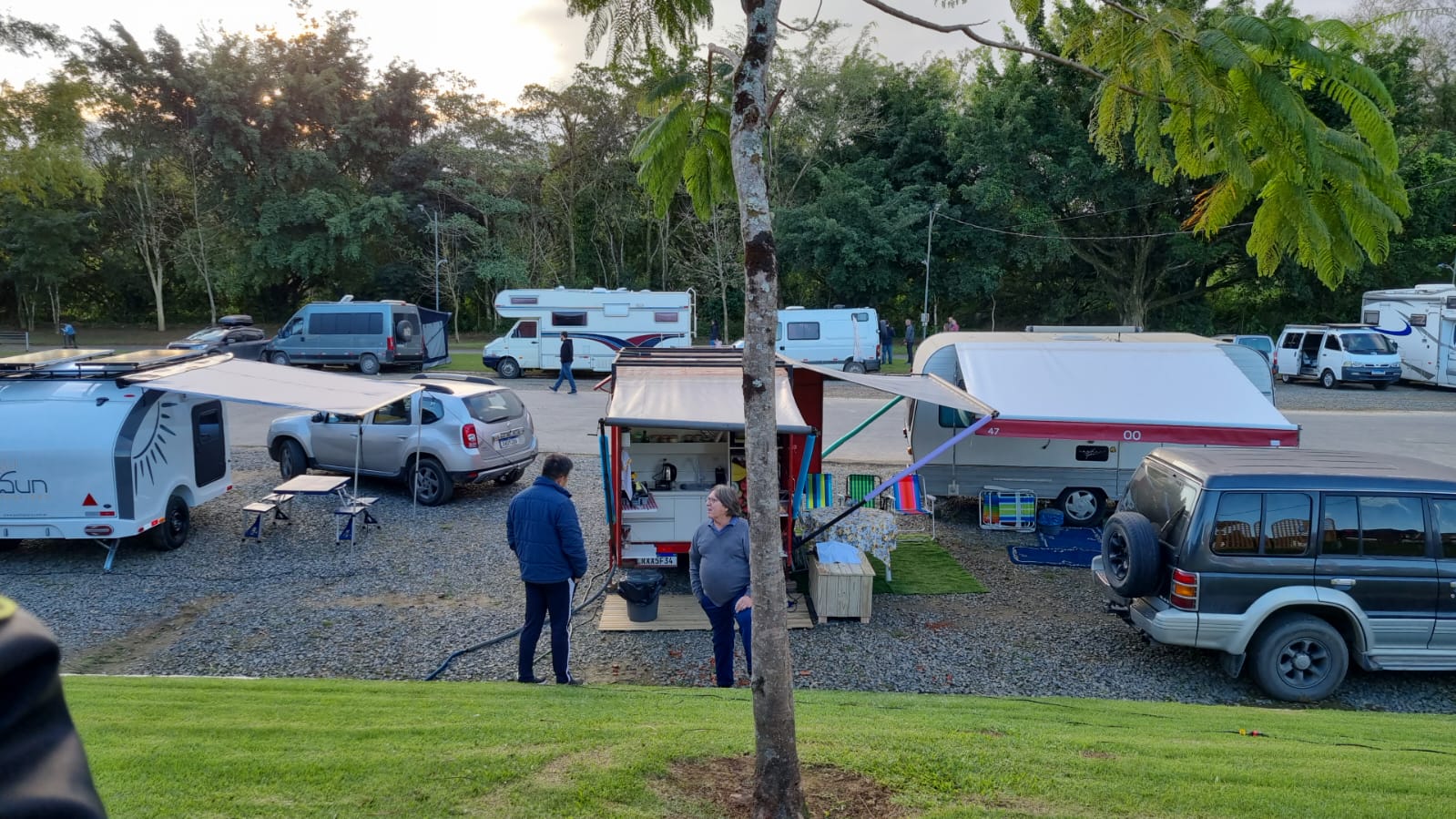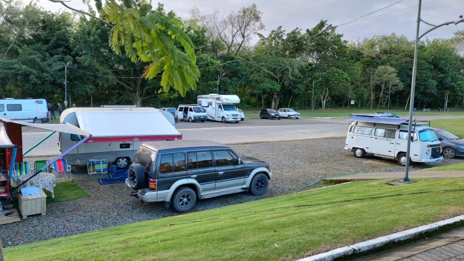 Parque urbano beira rio com bastante verde e famílias visitantes, centro de exposições e estacionamento com algumas tomadas e torneira para apoio de RVs. Ainda é algo informal. Parque aberto 24h com boa segurança. Nosso apontamento de GPS mostra o local exato onde estão a luz e água.
