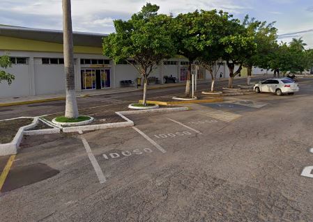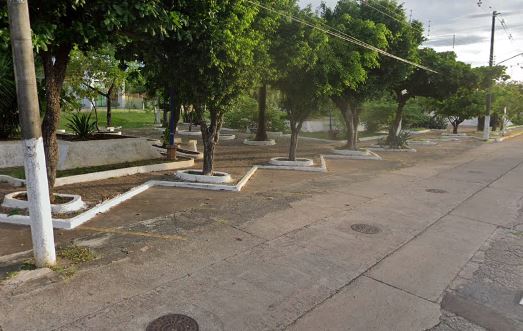 Bolsas de estacionamento em vagas 45 graus em frente ao aeroporto de Corumbá-MS. Sombras de árvores, sem estrutura de água e luz. Rua tranquila sem comércios.