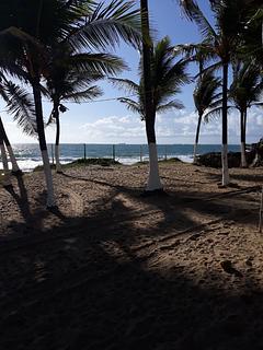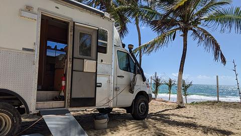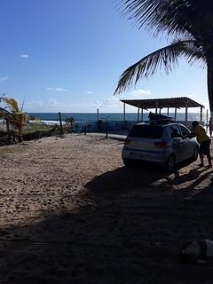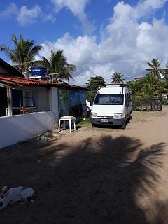 Carlos Batata é o proprietário do estacionamento ao longo da praia da Enseada dos Corais, uma bela praia com ondas para surfistas. Ele nos recebeu para ficar durante a noite e não se importaria com outros viajantes no futuro. 20 reais pela noite, com chuveiro externo e banheiros muito básicos, mas com vista direta para o oceano à sombra das palmeiras.