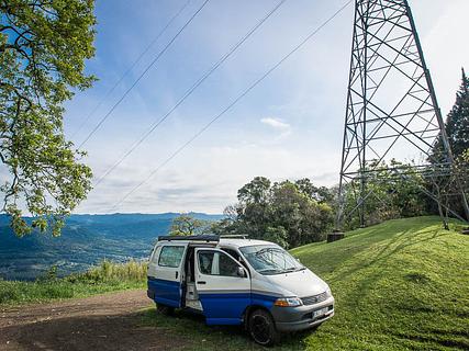- free - In the bend there is a large parking/picnic spot with lights and some remains of grills. We drove further behind it and parked under the power lines. Hard to level out, but possible for smaller vehicles, larger can stay on the picnic spots (but expect more noise and lights from passing cars) or there is a lower terrace that might be better. Nice views at night.