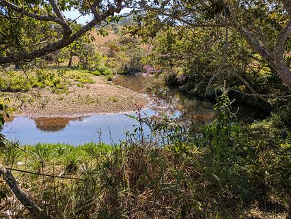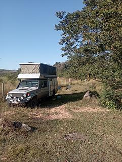 FREE. No Facilities.Grassed and treed parking areas.Map marker is exit from R451. Proceed 500m along good farm road and just before first bridge park on the left hand side. Or follow track through grass (suitable for all vehicles except big rigs) for 200m and it's flat and out of sight. River access for bathing.