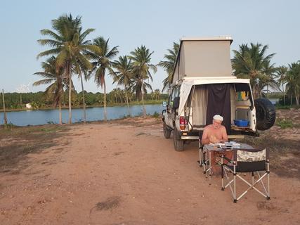 Não é um camping especificamente, mas há esta opção. Restaurante, banheiros e WI-fi. Represa para banho.