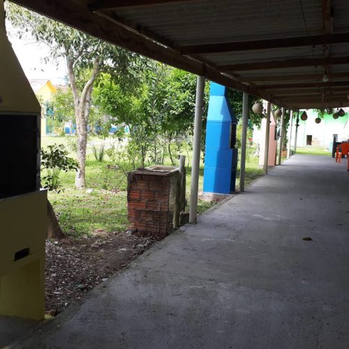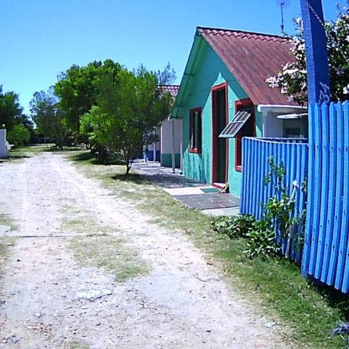 Espaços entre cabanas com churrasqueiras e sombras. Vila beira mar, antes do Chuí.