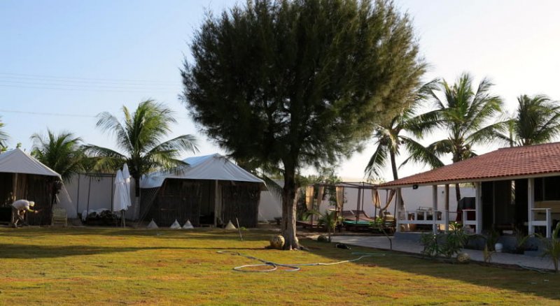 O camping tem cabanas feitas de varas de marmeleiro e cabanas feitas de paletes todas altamente ventiladas e sem mosquitos.O camping fica situada a 2 quadras da praia e no pé das dunas. O camping conta com energia e internet wifi e sala de tv com inúmeros canais e diferentes línguas. Disponibilizamos também uma cozinha e área para churrasco. O camping atende muito esportista principalmente do kite surfe!!