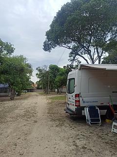 Large camping with some specific camper and big rig spaces (water, electric and dump stations at space). Some shade. Large communal kitchen with bbq area. Bathrooms with hot water. Very clean when we were there. WiFi, but that was a bit hot and miss fire me. R$45 pppn plus R$30 pn for rig if you connect for a/c, dump station etc., which we didn't. Right opposite beach and small food and drinks bar. It's about 500m before where it shows up on Google maps.
