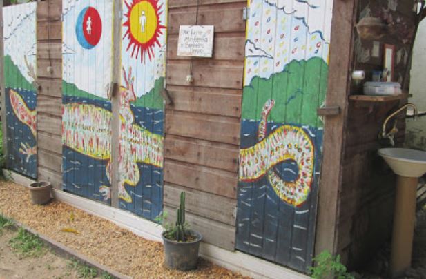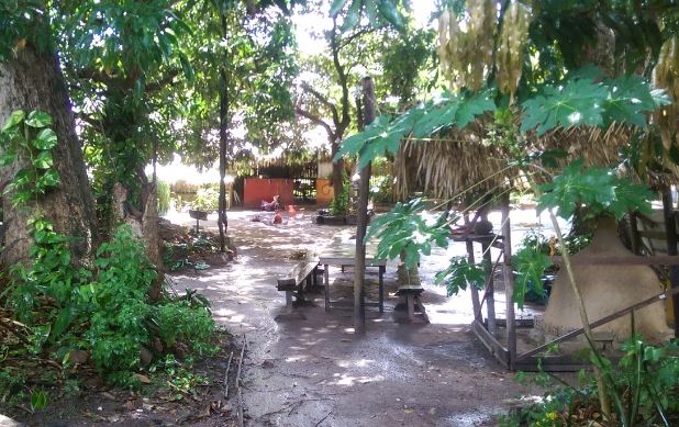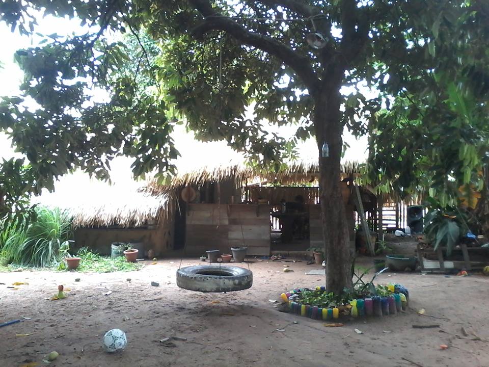 Espaço arborizado com construções tipicas da amazônia. Temos redário, lavanderia, banheiros e cozinha compartilhada, com fogão e forno à lenha.
