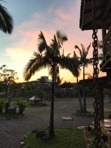 Pousada aconchegante e charmosa estilo rústico na Praia do Rosa em meio a natureza com muitas palmeiras no jardim. Pousada familiar.