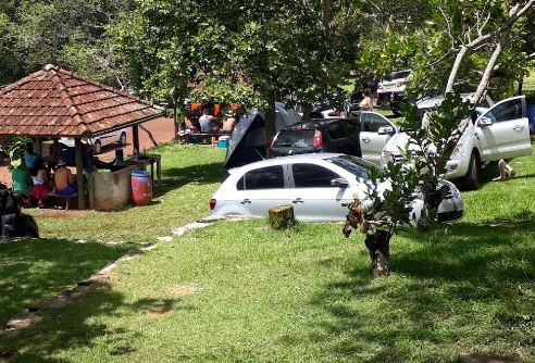 Área com muitas arvores e sombra, quiosques disponíveis para locação exclusiva, com churrasqueiras, mesas, bancos, pia, tomadas.de.energia, armador de redes, cachoeiras, trilhas ecológicas. Muita natureza. Temos restaurante e pousada dentro do balneário.