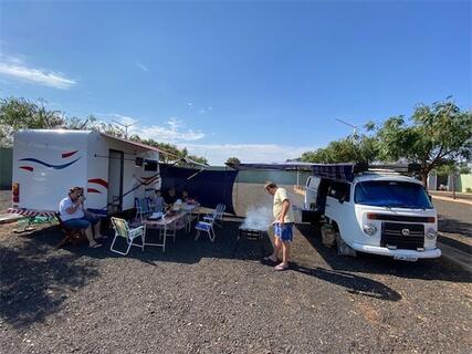 Área de apoio com banheiros (talvez não tão amigável para barracas) com luz, água e esgoto, banheiros, churrasqueira, piscina e WIFI junto ao hotel.