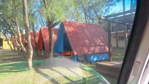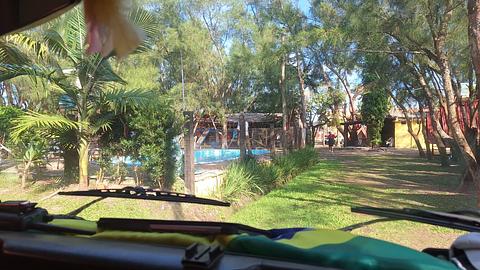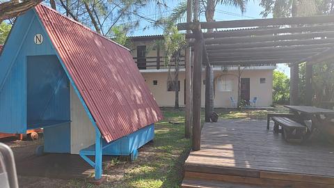Camping perto da praia que oferece pequenos chalés e apartamentos.banheiros limpos muitas árvores carros ficam em um estacionamento Wi-Fi estava muito ruim área coletiva com mesas