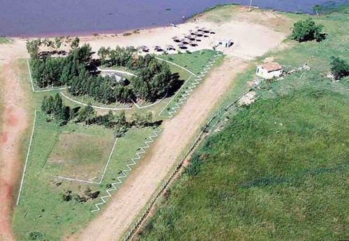 Ponto de camping na Praia do Cascalho a beira do Rio Paraná. Local de lazer de final de semana com restaurante, esportes náuticos, gramado e apoio de churrasqueiras com mesas.