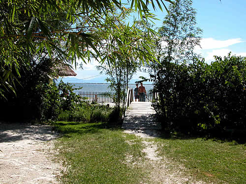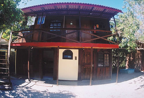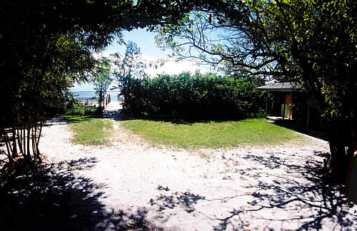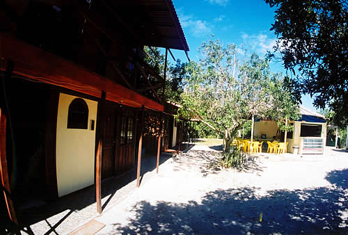 Nossa pousada fica localizada na frente da Praia das Encantadas a 80 metros do terminal de embarque. Vista de um conjunto de quartos na pousada com suítes no térreo e quartos simples para casal no andar superior. Vista da área interna da pousada e camping com a praia e mar no fundo. Outro visual da pousada e do bar e lanchonete. O bar/lanchonete e o conjunto de banheiros do camping. Outra casa com quartos da pousada. O bar e lanchonete.