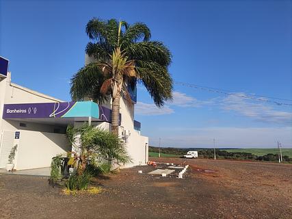 very large parking lot behind the gas station. friendly staff. shop and café. banheiros very clean. safe. recommended.