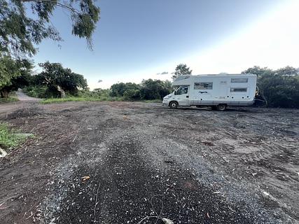 Very large parking of earth just next some trees. Listening road passing but also birds. Was no possible to get to the spot into the village due to a village party. No service but away from road. Felt safe. Flat/Place for many Big rigs. Easy access, all vehicles even tent