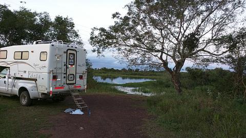 Ótimo local perto de uma das pontes de madeira. Limpo. Perfeitamente plano. À beira da água. A única desvantagem é que você é visível da estrada, mas há muito pouco tráfego.