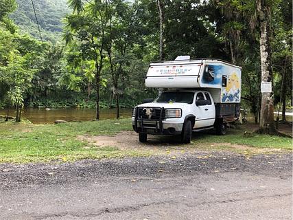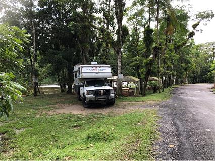Recreation area with grills, covers, tables. Swim in river. Rent tubes or swimming pool. Pay fee at little restaurant. We paid 20R for the night. Mostly a day use place for families on weekends. Quiet at night. Shade. Mosquitoes. Muddy after the rain. But more private and quiet than a posto!