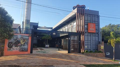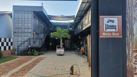 Hotel designado para motocicletas com um espaço de estacionamento seguro para sua moto. Conceito de contêiner. 150/noite.