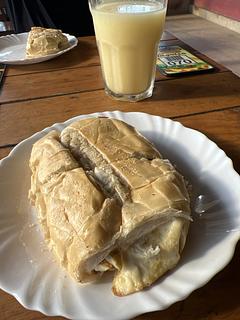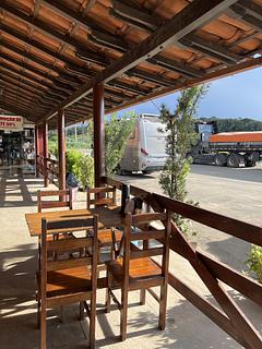 Ao lado de um posto de combustível. Tem almoço e os lanches. O pão com linguiça e queijo é realmente delicioso. Vale a pena. Pode pernoitar. Tem uma torneira. Banheiros limpos.