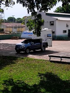 Local plano, com vista ao río Branco. Não tem estrutura, sim tem torneiras de água potavel no edificio da gcm. Há espacio esportivos. A guardia permitiou o pernoite Lugar plano, con vista al río Branco. No hay comodidades, si hay canilla de agua potableen el edificio de la guardia civil municipal. Hay muchas instalaciones deportivas. Pedimos permiso a la guardia y nos permitieron pernoctar