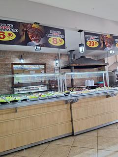 Nosso restaurante tem opções de preço para pagar por peso, ou um buffet livre ou um buffet com churrasco. Almocei por peso, o valor do quilo era R$ 6,90 por 100g. Ok, comida boa, lugar grande. Está localizado dentro de um grande posto, com um hotel e estacionamento.