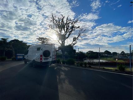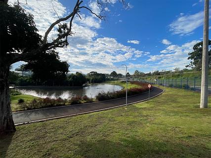 large parking lot on the side of the highway, the park is a large green area next to the city, has a large parking area, walking track, lake, night guards.