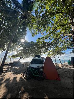 Estacionamento em frente ao mar. Sem instalações. Água em uma torneira do lado direito da entrada. Lugar seguro Francisca vende cocos por 5 Reais