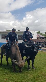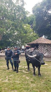 Here on the lawn beside the Municipal Market on Friday morning around 10.30am we saw two policemen on buffalo. They were more than happy to pose with tourists for photos. Later we saw them riding down the main street.