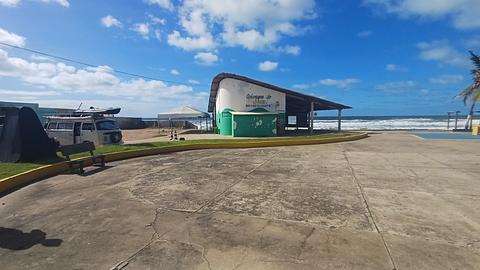 Os banheiros estão disponíveis das 9h às 17h no quiosque do Joel. Recomendo comprar algo do Joel, que é muito acolhedor. Há um chuveiro e uma tomada. Você pode conectar o chuveiro ao disjuntor. Água está disponível na pia do bar ou no chuveiro da praia.