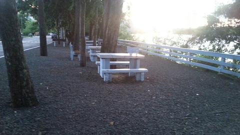 Street parking along the river quiet, safe. picnic tables, churrasco pits and garbage bins. Great place to spend the last night in Brazil prior to the border crossing.