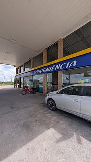 Gas station with parking for 1 or 2 big rigs. It closes down at 8 pm so it is quiet at night. There is a convenience store, electricity (by the air station, 220 volts, single phase) and water (non-potable). Toilets and showers are also available.