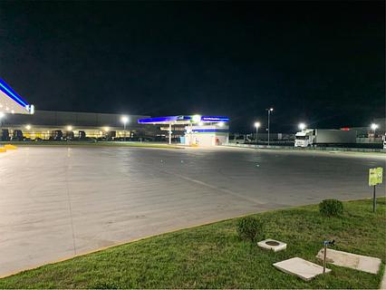 Posto de combustíveis SIM. Novíssimo e com uma enorme área de estacionamento. Ótimo lugar para pernoitar com um grande espaço para caminhões. Há uma loja bonita e organizada onde você pode encontrar alimentos e comodidades, incluindo bons vinhos e bebidas a preços acessíveis. Eu não consegui ver/verificar eletricidade e água, é possível que eles tenham.