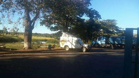 Parking next to a river a bit away from shops and gas station. Waterfall masks any noise. Picknic tables and bbq available. Parking and restrooms incl. shower free