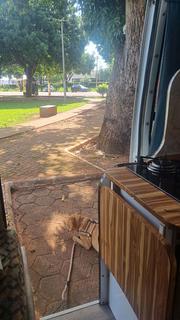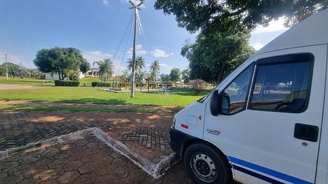 Ampla praça com muitos recuos para estacionamento. Tem tomada no pé do poste, a moça do quiosque vermelho disponibilizou água da mangueira e ao lado da praça tem um posto de combustivel com banheiro e ducha liberada.