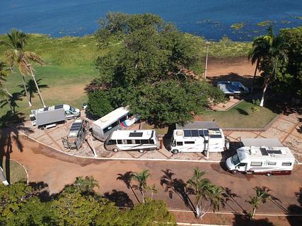 Local tranquilo tem um restaurante que pode fornecer energia, água tem uma torneira logo mais a frente da cobertura, no restaurante é possível pedir para chamar o pessoal da secretaria do turismo, pois aqui eles acolhem o caravanismo, se você for autônomo de energia fica sem nem ter que chamar ninguém, tem banheiro 24 horas, pega bem 4g vivo e Tim, talvez outras, mas eu não sei, cidade tranquila é muito boa pra quem gosta de pescar, aos finais de semana dá um pouco de movimento, e o comércio é bom, e a natureza é linda isso sem contar as incontáveis araras que cruzam o céu.