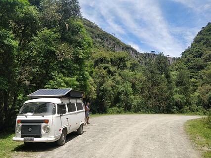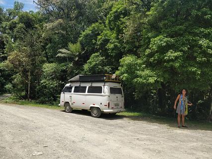 Trilha de acesso à Cachoeira do Avencal. Estrada de cascalho sem saída. Estacionamento no meio da floresta, com um pequeno rio. Calmo. Caminhada moderada de 10 minutos sobre grandes pedras até a Cachoeira do Avencal de 100 m. Amigável para barracas, dependendo de quão visível você se importa em estar. Área pública, mas tranquila. Bom lugar para campistas com motorhome.