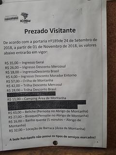 Algumas informações atualizadas: a taxa de entrada para estrangeiros é de 35 BRL, se você quiser escalar uma montanha, é 57 BRL. Veja a imagem anexada para a lista completa. A entrada é válida em ambos os portões (Petrópolis, Teresópolis) no dia emitido. Teresópolis tem mais a oferecer e geralmente tem as melhores vistas. A entrada de Petrópolis não tem estacionamento e não há muito espaço para manobrar, você pode, no entanto, estacionar a cerca de 100m antes do portão por 10 BRL/dia (motos 5 BRL). Você provavelmente poderia acampar lá também. Descrição original: Após visitar Petrópolis por alguns dias, seguimos para a Serra dos Órgãos para fazer a tradicional trilha de 32 km até Teresópolis em 3 dias. Deixamos nosso motorhome na pousada Cronos, onde ficamos na cidade, mas também há estacionamentos próximos ao Parque que cobram de 10 a 15 reais por dia. Pegamos um táxi por 70 reais, mas é possível pegar 2 ônibus da cidade também. A taxa de entrada é de 32 reais para brasileiros, há taxas extras por dia e para a pousada. Pagamos 80 reais cada um por 3 dias no parque e 2 noites nas pousadas.