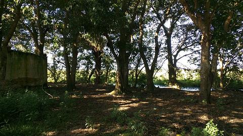 Possibly a good wild camp, with lots of shade and dry land, but also some mud/still water. Next to two deserted buildings and a wooden wagon.