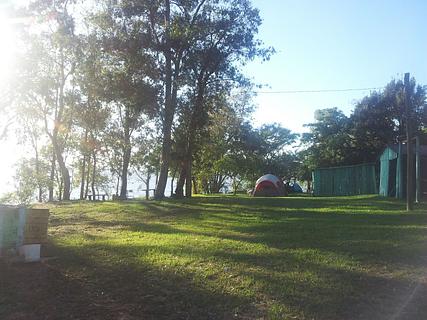 Passe pela última porta à direita, logo antes da ponte. Um acampamento agradável no jardim de uma fazenda. Com mesas, churrasqueiras e banheiros simples. Pagamos 70 Reais para 2 pessoas e um carro.