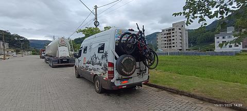 Local tranquilo e seguro pra pernoite ao lado da rodovia onde tem um estacionamento de caminhões ao lado de um terreno, com várias árvores com sombra.
