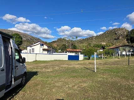 Open grassy area behind the village next to entrance to the Pousada parking. Asked permission at restaurant Adilson. Permitted to park for overnight in the vehicle. No camping allowed. Do not expose anything outside the vehicle. Chairs, etc. Consumption at the restaurant will easy permission to park. Wonderful night sky!