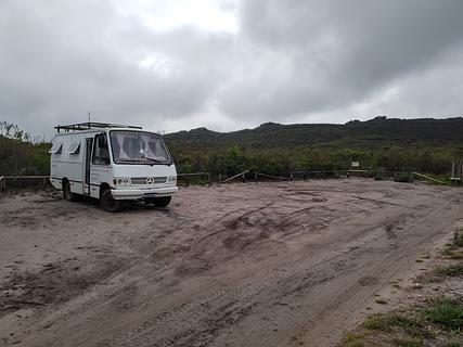 Estacionamento da rota da cachoeira, um grande estacionamento na entrada do parque o local e bem isolado e escuro a noite não tem iluminação, se tiver em 2 MH da pra dormir tranquilo.Não vai ser difícil você pegar água na rua vimos várias torneiras. Não vimos mercado. Você vai passar por um portal me parece ser de um bairro planejado. Sinal de celular pega, porém somente da claro que dá 3G básico.Estrada de fácil acesso, não tem atoleiros com lamas ou Areia, qualquer carro vai. Não vai ser difícil você pegar água na rua vimos várias torneiras.
