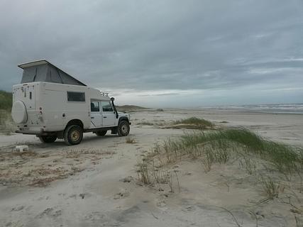 Acampamento selvagem ao longo da praia. Estrada de acesso logo ao lado do posto de gasolina. Cuidado: areia profunda. Como meu marido disse: "com um LandRover você pode dirigir ao longo da praia, com um caminhão você fica preso." ;-)